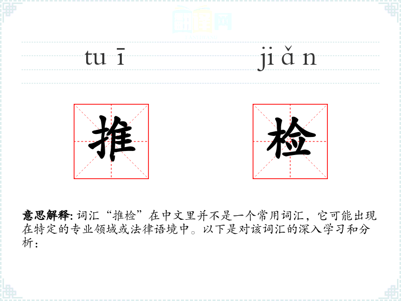 词汇“推检”在中文里并不是一个常用词汇,它可能出现在特定的专业领域或法律语境中。以下是对该词汇的深入学习和分析: