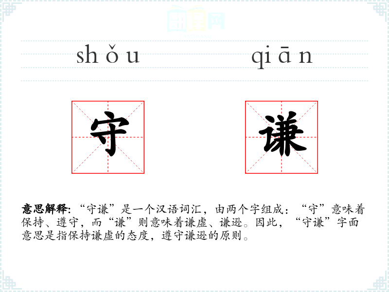 “守谦”是一个汉语词汇,由两个字组成:“守”意味着保持、遵守,而“谦”则意味着谦虚、谦逊。因此,“守谦”字面意思是指保持谦虚的态度,遵守谦逊的原则。