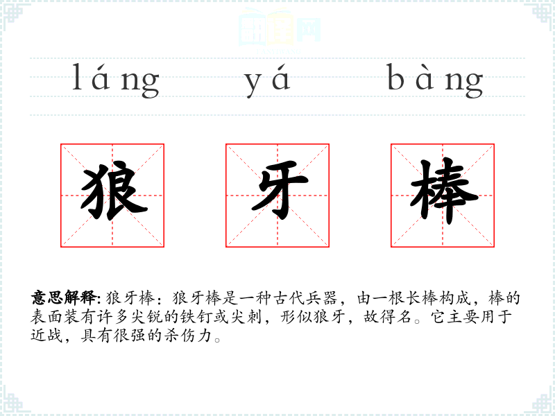 - 反义词:和平盾、守护杖(这些词汇在意义上与狼牙棒相反,强调保护而非攻击)