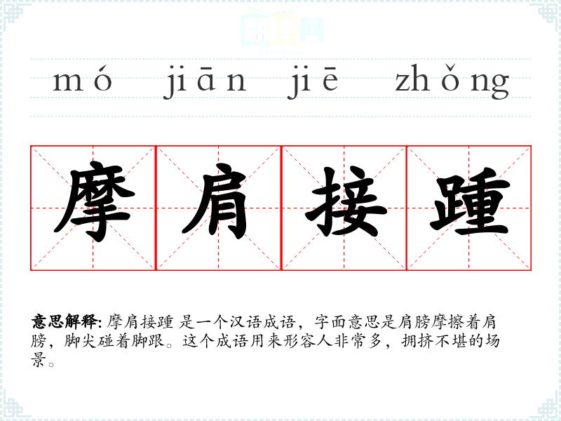 摩肩接踵 是一个汉语成语,字面意思是肩膀摩擦着肩膀,脚尖碰着脚跟。这个成语用来形容人非常多,拥挤不堪的场景。