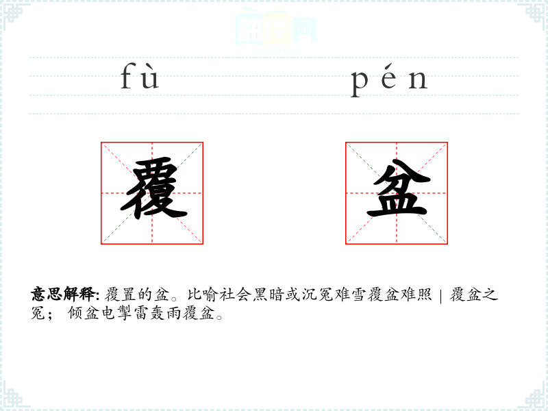 覆置的盆。比喻社会黑暗或沉冤难雪