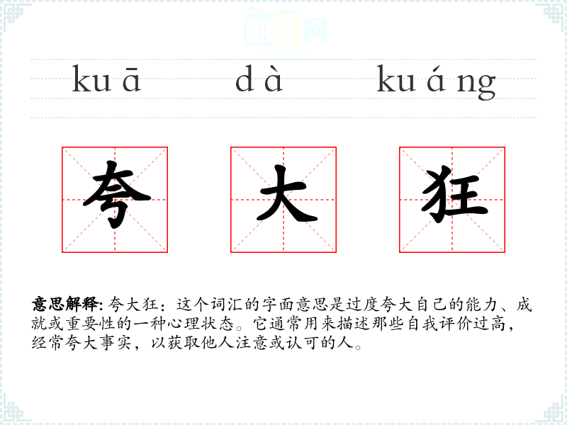夸大狂:这个词汇的字面意思是过度夸大自己的能力、成就或重要性的一种心理状态。它通常用来描述那些自我评价过高,经常夸大事实,以获取他人注意或认可的人。