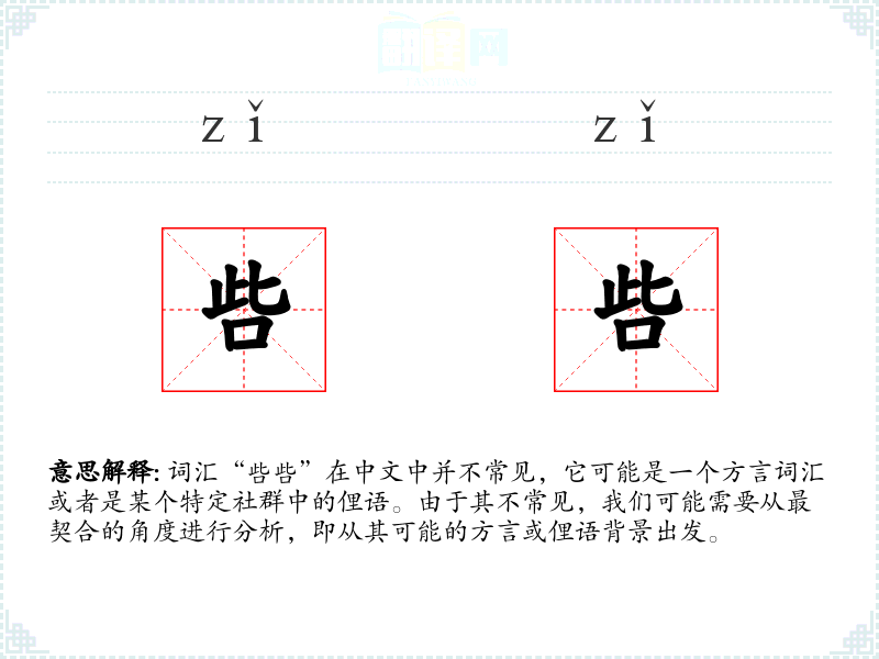 由于“呰呰”不是一个标准汉语词汇,我们无法给出一个确切的字面意思和基本含义。它可能是模拟声音的词汇,比如模仿某种声音,或者是某个地方特有的表达方式。