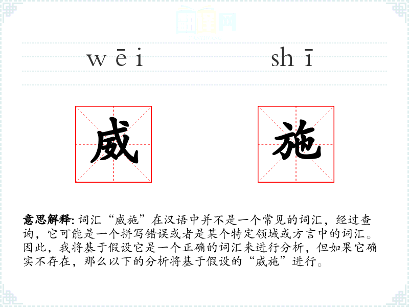 假设“威施”是一个词汇,它可能由两个汉字组成,每个字都有其独立的含义。例如,“威”通常指力量、权威或威严,而“施”则可能指施行、施加或施舍。结合起来,“威施”可能指的是施加权威或力量的行为。