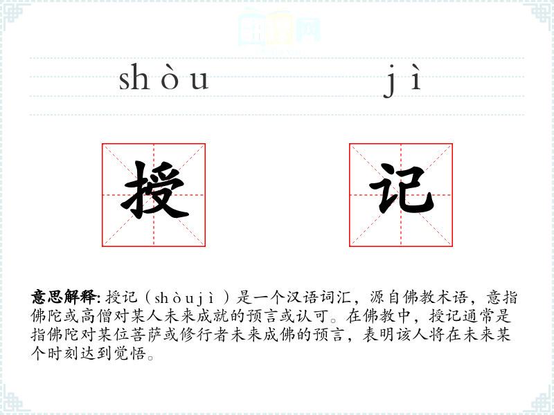 授记(shòu jì)是一个汉语词汇,源自术语,意指佛陀或高僧对某人未来成就的预言或认可。在中,授记通常是指佛陀对某位菩萨或修行者未来成佛的预言,表明该人将在未来某个时刻达到觉悟。