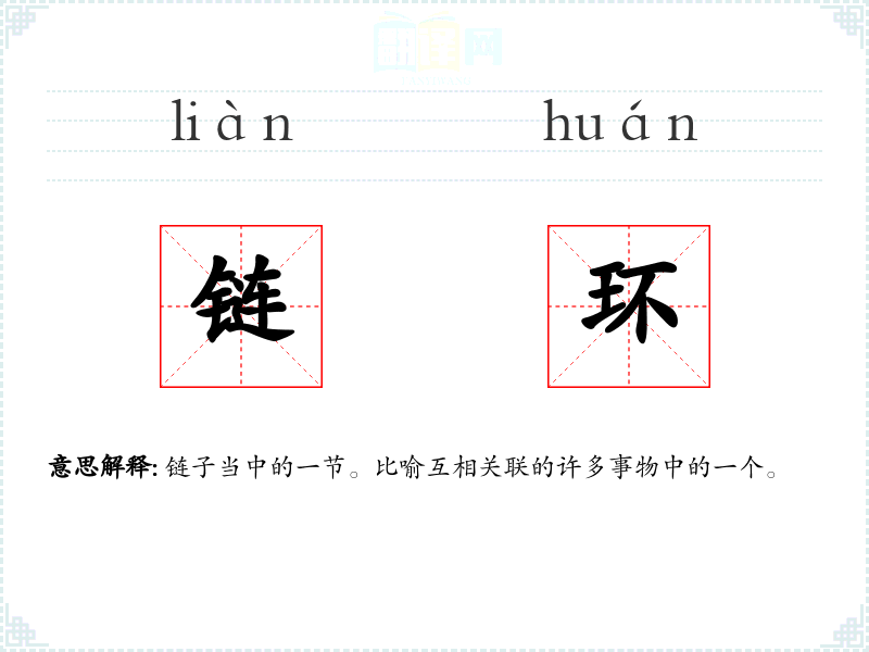 链子当中的一节。比喻互相关联的许多事物中的一个。