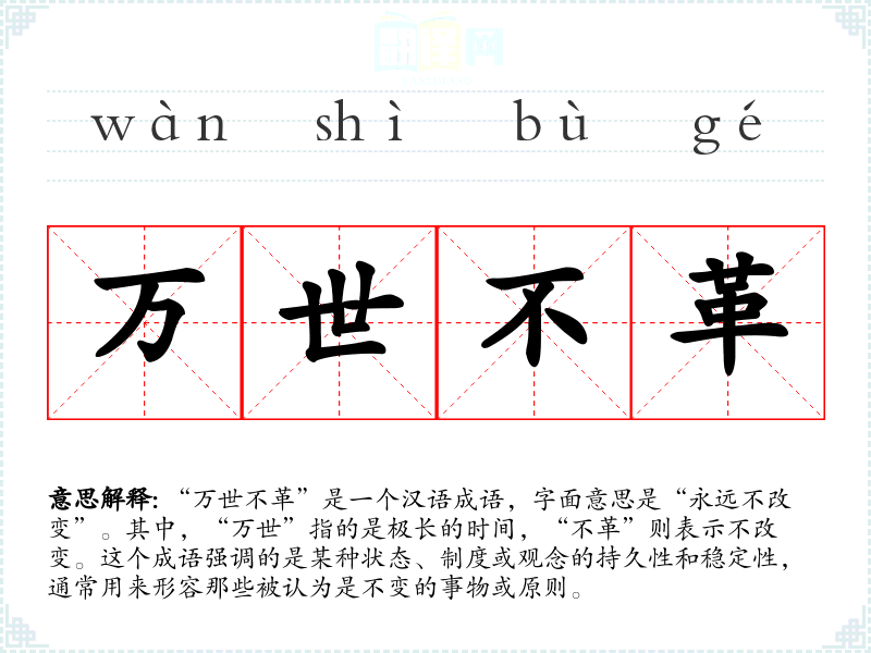 在其他文化中,类似的表达可能是“eternal”或“unchanging”,但“万世不革”特有的汉语韵味和历史深度是其他语言难以完全复制的。