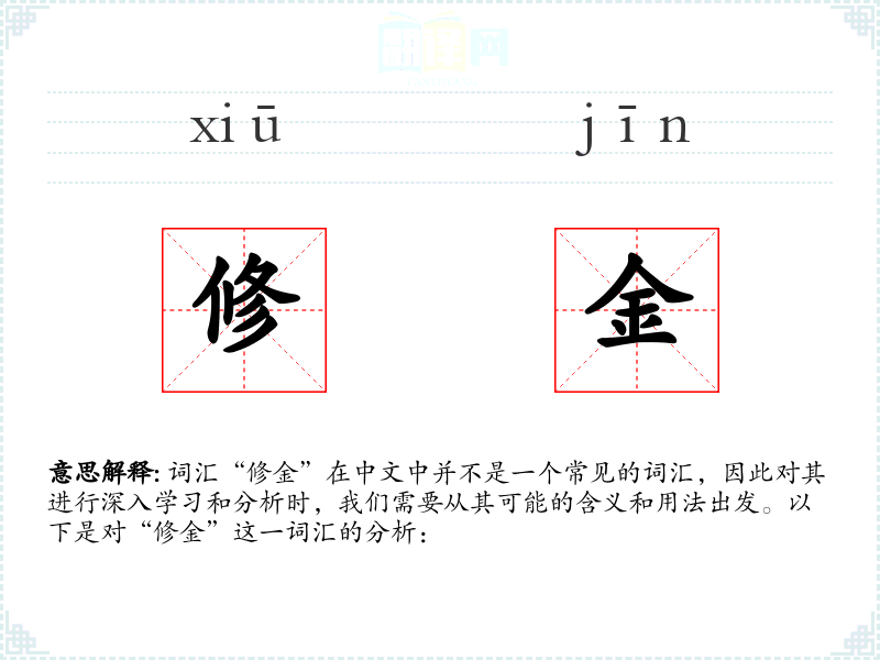词汇“修金”在中文中并不是一个常见的词汇,因此对其进行深入学习和分析时,我们需要从其可能的含义和用法出发。以下是对“修金”这一词汇的分析: