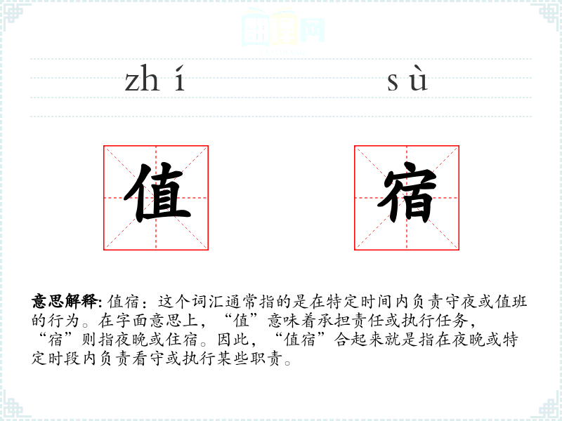 值宿:这个词汇通常指的是在特定时间内负责守夜或值班的行为。在字面意思上,“值”意味着承担责任或执行任务,“宿”则指夜晚或住宿。因此,“值宿”合起来就是指在夜晚或特定时段内负责看守或执行某些职责。