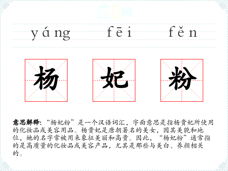 - 反义词:(由于“杨妃粉”特指高质量的化妆品,反义词可能不太适用,但可以考虑“劣质粉”或“廉价化妆品”)
