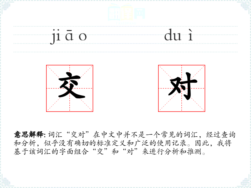 词汇“交对”在中文中并不是一个常见的词汇,经过查询和分析,似乎没有确切的标准定义和广泛的使用记录。因此,我将基于该词汇的字面组合“交”和“对”来进行分析和推测。