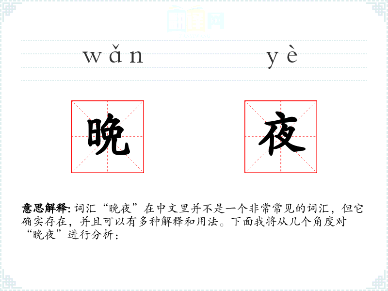 词汇“晚夜”在中文里并不是一个非常常见的词汇,但它确实存在,并且可以有多种解释和用法。下面我将从几个角度对“晚夜”进行分析: