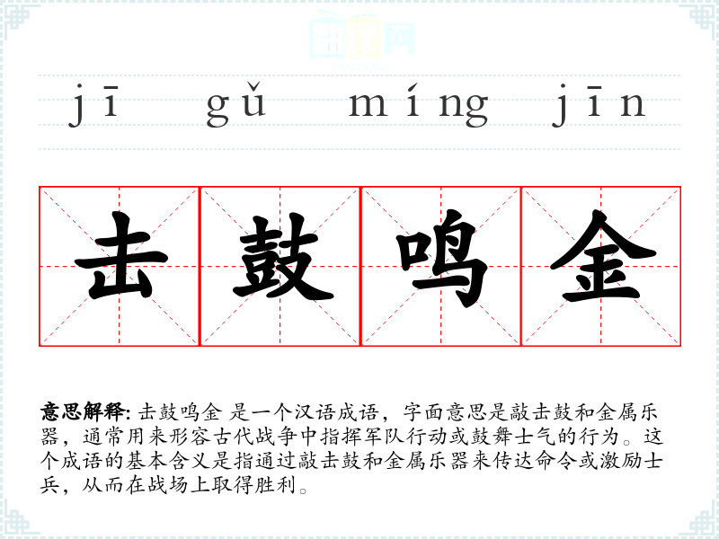 击鼓鸣金 是一个汉语成语,字面意思是敲击鼓和金属乐器,通常用来形容古代战争中指挥军队行动或鼓舞士气的行为。这个成语的基本含义是指通过敲击鼓和金属乐器来传达命令或激励士兵,从而在战场上取得胜利。