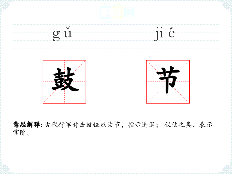 古代行军时击鼓钲以为节,指示进退; 仪仗之类,表示官阶。