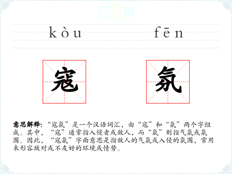 “寇氛”是一个汉语词汇,由“寇”和“氛”两个字组成。其中,“寇”通常指入侵者或敌人,而“氛”则指气氛或氛围。因此,“寇氛”字面意思是指敌人的气氛或入侵的氛围,常用来形容敌对或不友好的环境或情势。