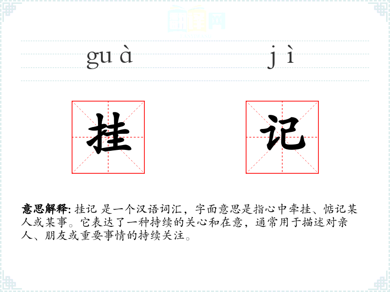 挂记 是一个汉语词汇,字面意思是指心中牵挂、惦记某人或某事。它表达了一种持续的关心和在意,通常用于描述对亲人、朋友或重要事情的持续关注。