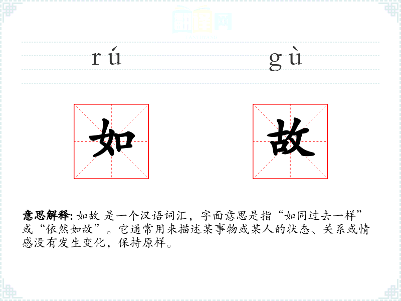 如故 是一个汉语词汇,字面意思是指“如同过去一样”或“依然如故”。它通常用来描述某事物或某人的状态、关系或情感没有发生变化,保持原样。