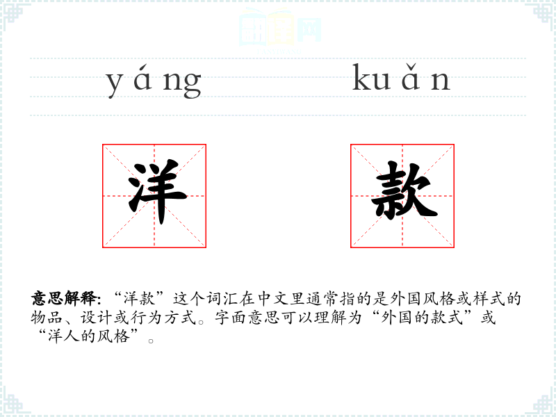 “洋款”一词源于对“洋”(指外国)和“款”(指样式或风格)的组合。随着全球化的发展,这个词的使用频率可能有所增加,因为它反映了人们对国际文化和时尚的兴趣。