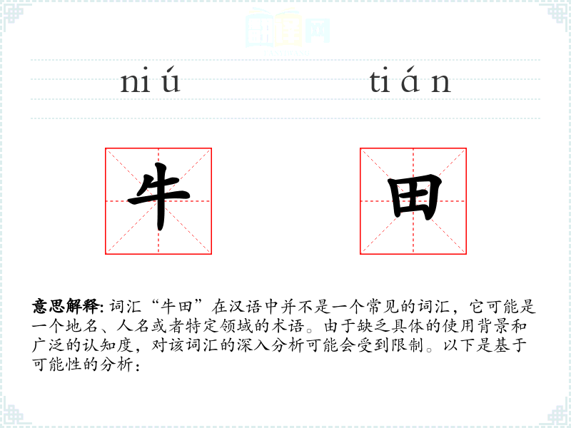 - 由于“牛田”不是一个广泛使用的词汇,其词源和演变可能不明确,可能是一个特定地区或家族的命名。