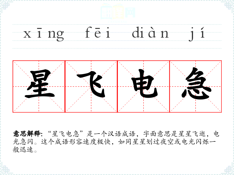 “星飞电急”这个成语的词源较为模糊,但它显然是受到自然现象的启发,特别是星星和闪电的快速移动。在古代文学中,这个成语可能用来形容战争或武术中的快速动作,随着时间的推移,它的使用范围扩大到了更广泛的语境。