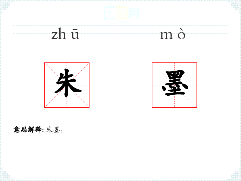 - 字面意思:朱墨通常指的是红色的墨水或颜料,其中“朱”指的是红色,“墨”指的是墨水或颜料。