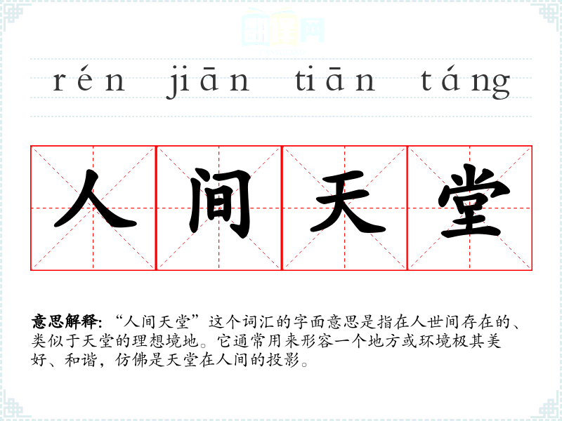 “人间天堂”这个词汇的字面意思是指在人世间存在的、类似于天堂的理想境地。它通常用来形容一个地方或环境极其美好、和谐,仿佛是天堂在人间的投影。
