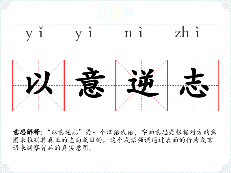 “以意逆志”是一个汉语成语,字面意思是根据对方的意图来推测其真正的志向或目的。这个成语强调通过表面的行为或言语来洞察背后的真实意图。
