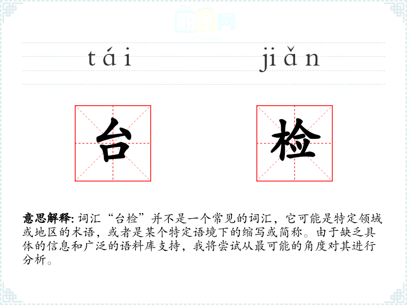 词汇“台检”并不是一个常见的词汇,它可能是特定领域或地区的术语,或者是某个特定语境下的缩写或简称。由于缺乏具体的信息和广泛的语料库支持,我将尝试从最可能的角度对其进行分析。