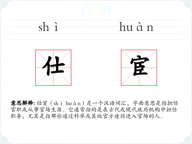 仕宦(shì huàn)是一个汉语词汇,字面意思是指担任官职或从事官场生涯。它通常指的是在古代或现代政府机构中担任职务,尤其是指那些通过科举或其他官方途径进入官场的人。