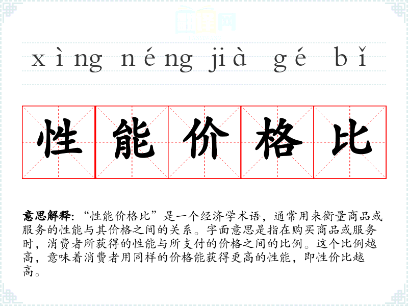 “性能价格比”是一个经济学术语,通常用来衡量商品或服务的性能与其价格之间的关系。字面意思是指在购买商品或服务时,消费者所获得的性能与所支付的价格之间的比例。这个比例越高,意味着消费者用同样的价格能获得更高的性能,即性价比越高。