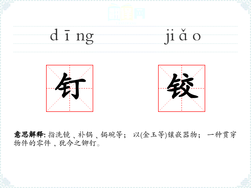 指洗镜﹑补锅﹑锔碗等; 以(金玉等)镶嵌器物; 一种贯穿物件的零件﹐犹今之铆钉。