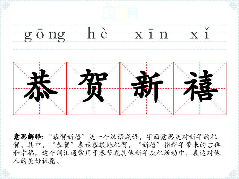 “恭贺新禧”是一个汉语成语,字面意思是对新年的祝贺。其中,“恭贺”表示恭敬地祝贺,“新禧”指新年带来的吉祥和幸福。这个词汇通常用于春节或其他新年庆祝活动中,表达对他人的美好祝愿。