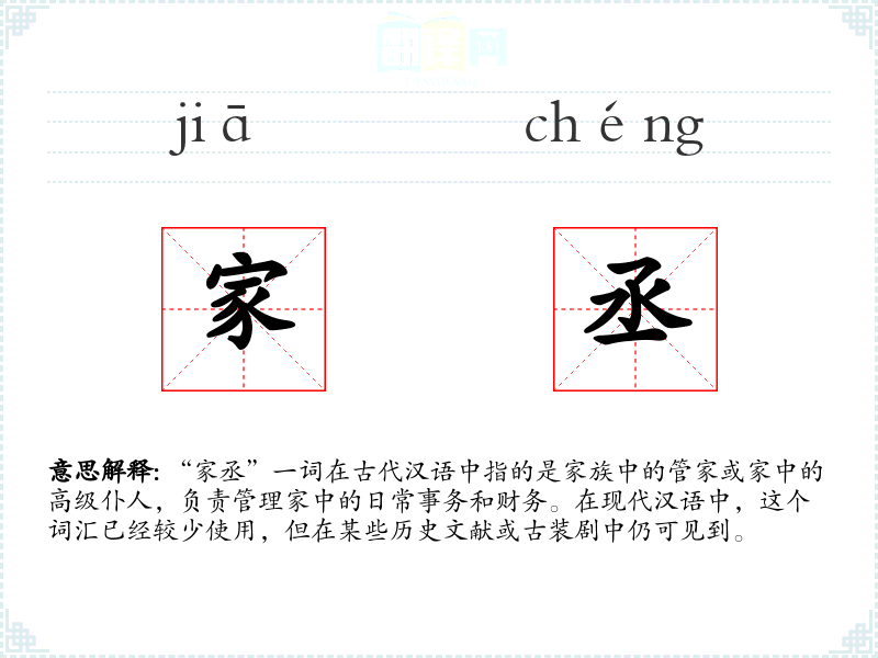 “家丞”一词在古代汉语中指的是家族中的管家或家中的高级仆人,负责管理家中的日常事务和财务。在现代汉语中,这个词汇已经较少使用,但在某些历史文献或古装剧中仍可见到。