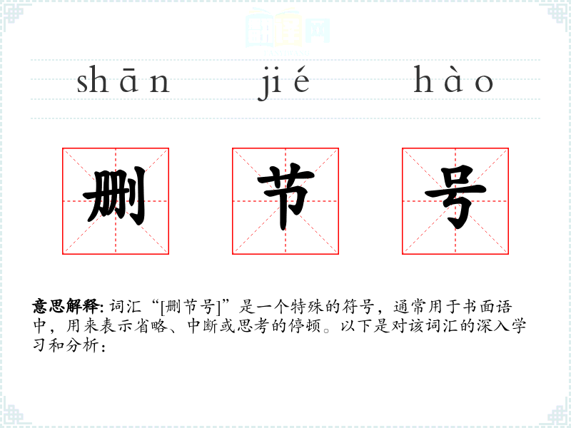 词汇“[删节号]”是一个特殊的符号,通常用于书面语中,用来表示省略、中断或思考的停顿。以下是对该词汇的深入学习和分析: