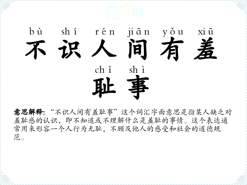 “不识人间有羞耻事”这个词汇字面意思是指某人缺乏对羞耻感的认识,即不知道或不理解什么是羞耻的事情。这个表达通常用来形容一个人行为无耻,不顾及他人的感受和社会的道德规范。