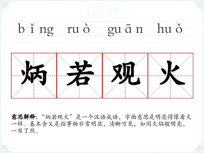 “炳若观火”是一个汉语成语,字面意思是明亮得像看火一样。基本含义是指事物非常明显,清晰可见,如同火焰般明亮,一目了然。