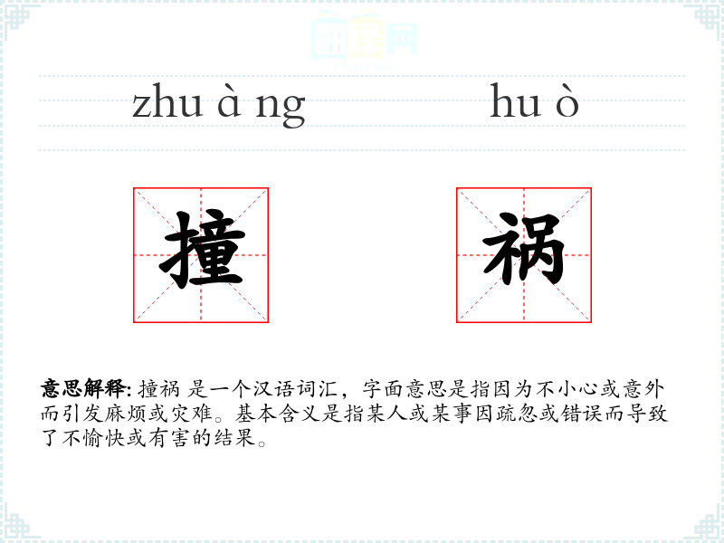 撞祸 是一个汉语词汇,字面意思是指因为不小心或意外而引发麻烦或灾难。基本含义是指某人或某事因疏忽或错误而导致了不愉快或有害的结果。
