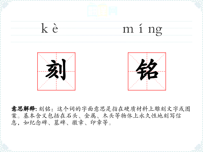 刻铭:这个词的字面意思是指在硬质材料上雕刻文字或图案。基本含义包括在石头、金属、木头等物体上永久性地刻写信息,如纪念碑、墓碑、徽章、印章等。
