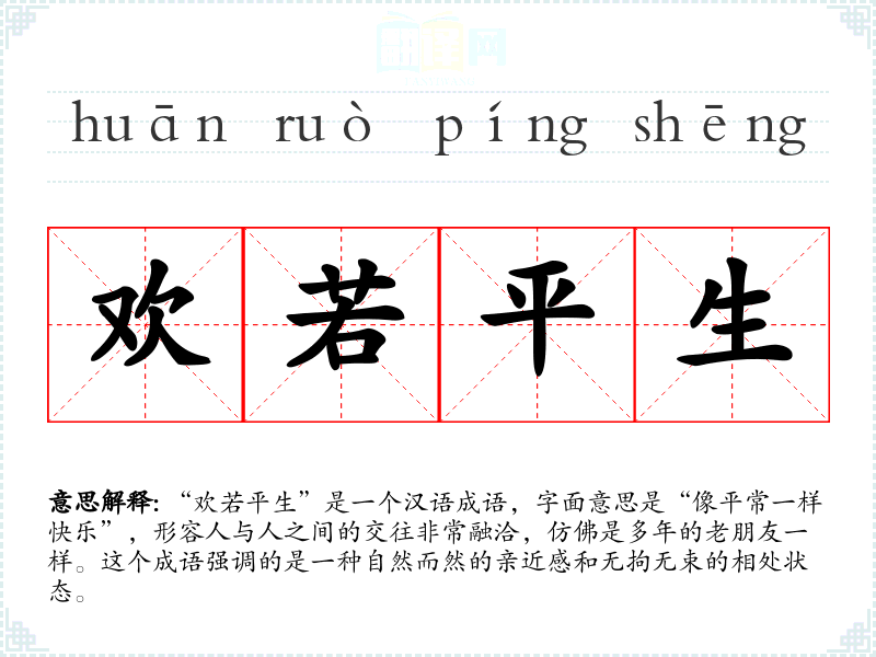 “欢若平生”是一个汉语成语,字面意思是“像平常一样快乐”,形容人与人之间的交往非常融洽,仿佛是多年的老朋友一样。这个成语强调的是一种自然而然的亲近感和无拘无束的相处状态。