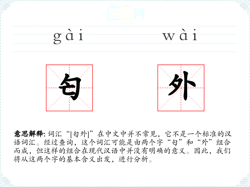 词汇“[匄外]”在中文中并不常见,它不是一个标准的汉语词汇。经过查询,这个词汇可能是由两个字“匄”和“外”组合而成,但这样的组合在现代汉语中并没有明确的意义。因此,我们将从这两个字的基本含义出发,进行分析。