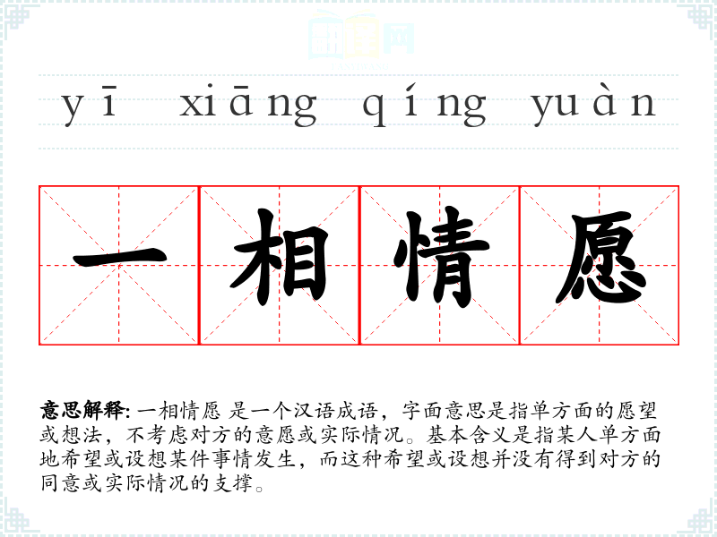 一相情愿 是一个汉语成语,字面意思是指单方面的愿望或想法,不考虑对方的意愿或实际情况。基本含义是指某人单方面地希望或设想某件事情发生,而这种希望或设想并没有得到对方的同意或实际情况的支撑。