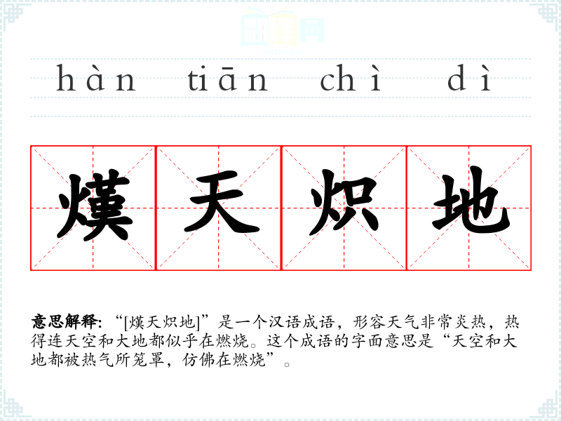 “[熯天炽地]”是一个汉语成语,形容天气非常炎热,热得连天空和大地都似乎在燃烧。这个成语的字面意思是“天空和大地都被热气所笼罩,仿佛在燃烧”。