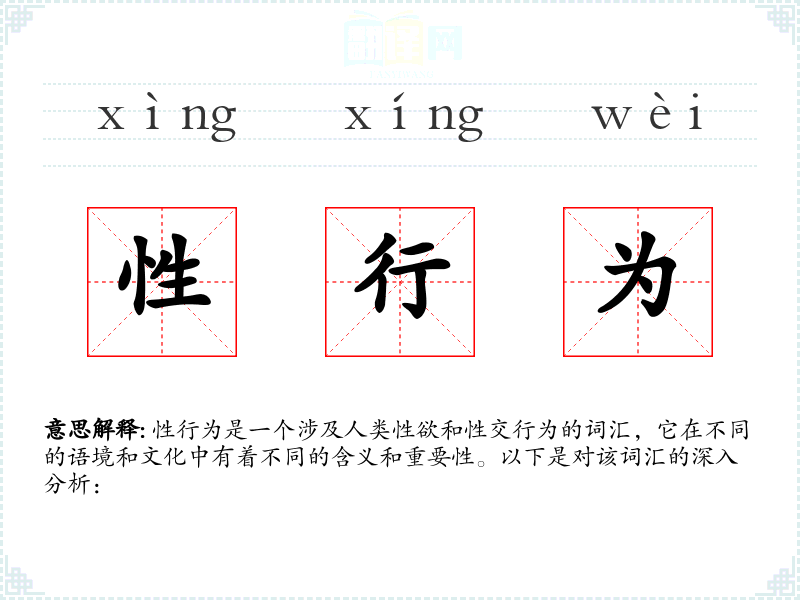 性行为是一个涉及人类性欲和性交行为的词汇,它在不同的语境和文化中有着不同的含义和重要性。以下是对该词汇的深入分析: