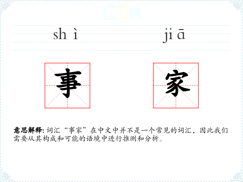 词汇“事家”在中文中并不是一个常见的词汇,因此我们需要从其构成和可能的语境中进行推测和分析。