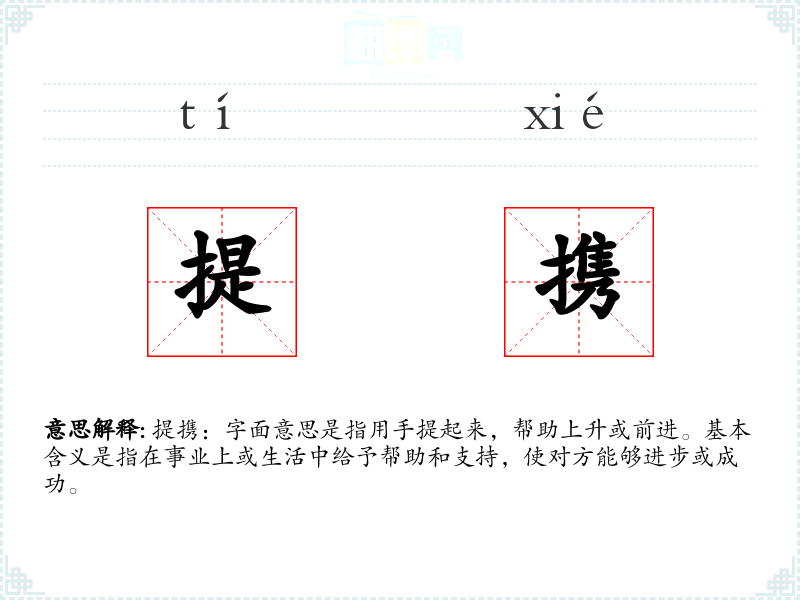 提携:字面意思是指用手提起来,帮助上升或前进。基本含义是指在事业上或生活中给予帮助和支持,使对方能够进步或成功。