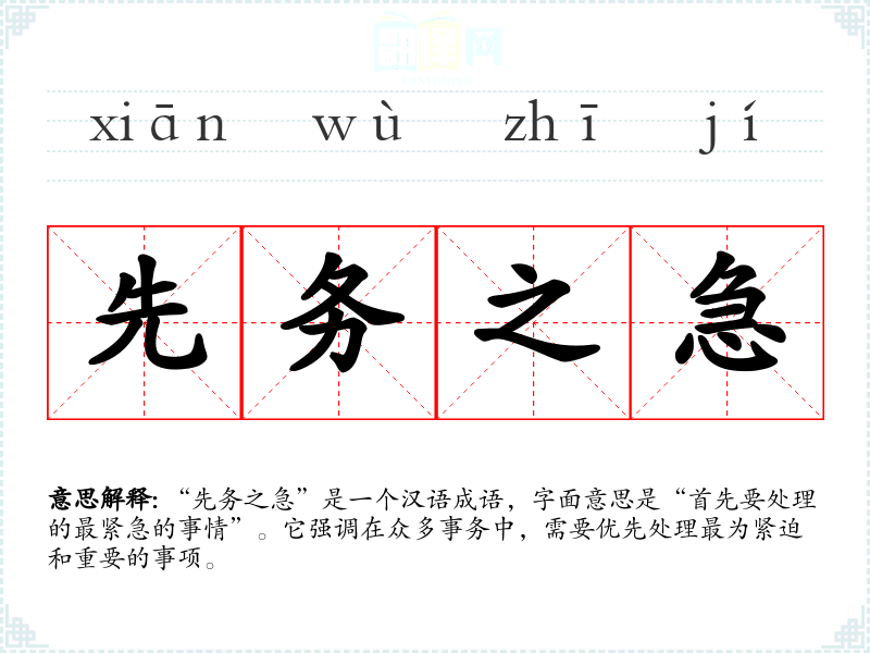 “先务之急”是一个汉语成语,字面意思是“首先要处理的最紧急的事情”。它强调在众多事务中,需要优先处理最为紧迫和重要的事项。