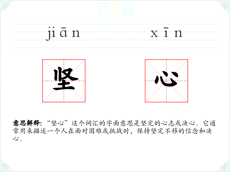 “坚心”这个词汇的字面意思是坚定的心志或决心。它通常用来描述一个人在面对困难或挑战时,保持坚定不移的信念和决心。