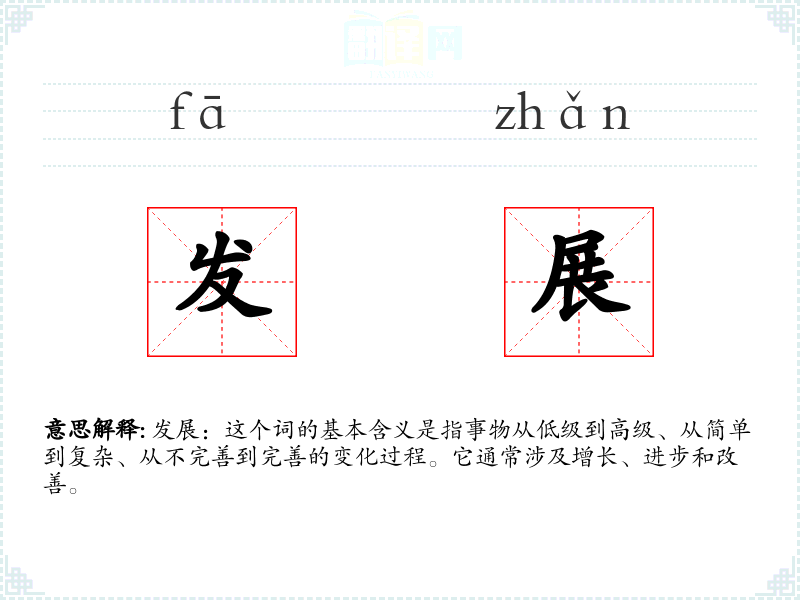 发展:这个词的基本含义是指事物从低级到高级、从简单到复杂、从不完善到完善的变化过程。它通常涉及增长、进步和改善。