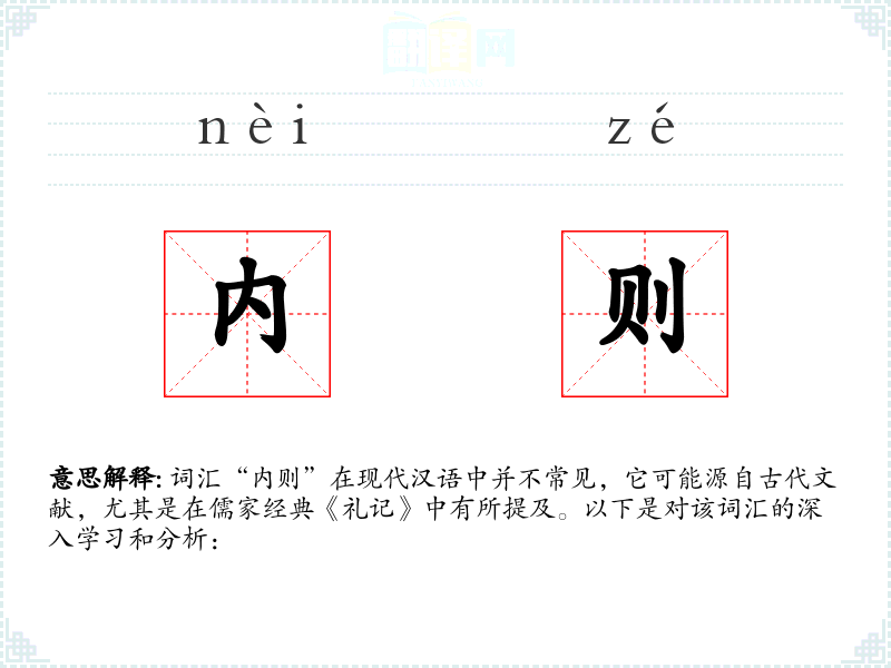 词汇“内则”在现代汉语中并不常见,它可能源自古代文献,尤其是在儒家经典《礼记》中有所提及。以下是对该词汇的深入学习和分析: