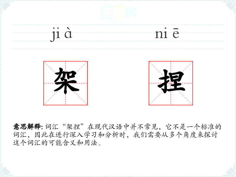 综上所述,词汇“架捏”在现代汉语中不是一个标准的词汇,因此我们无法对其进行深入的学习和分析。如果这个词汇是某个特定方言或社群中的俚语,那么它可能在特定的语境中具有特定的含义和用法。
